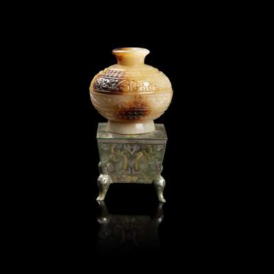 GREY AND BROWN JADE LIDDED BOX ON BRONZE STAND