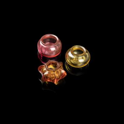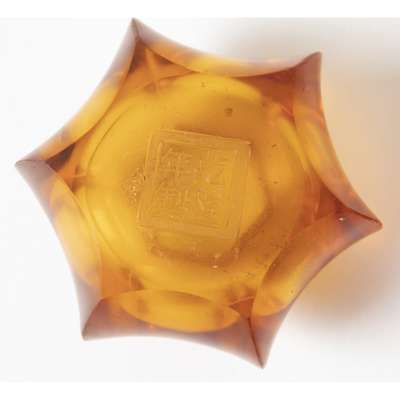 two of circular, and the third of six-pointed section, the glass of yellow, ruby-red and amber tones, each washer with an incised apocryphal Qianlong reign mark to the base (3)