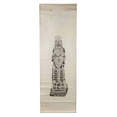 A comparable ink rubbing of the Bodhisattva without inscription is in the Shaanxi Province Art Museum, attributed to Avalokitesvara and the original work of the Sui dynasty. Also see a comparable example inscribed by Pu Xinyu, sold at Rongbaozhai, Nanjing, 8 July 2017, lot 310.