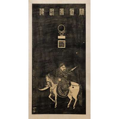 Guan Yu (160-220), also known as Guan Yunchang, was a Chinese military general during the late Eastern Han Dynasty. This rubbing is taken from a Qing engraving of Guan Yu by Li Jintai based on a Ming dynasty stone carving. A comparable example is at the Berkeley Library, University of California, accession no. Tsa 179.