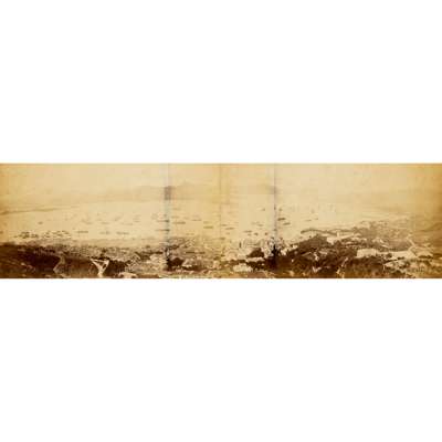 composite sepia panorama photograph of Hong Kong Bay, mounted