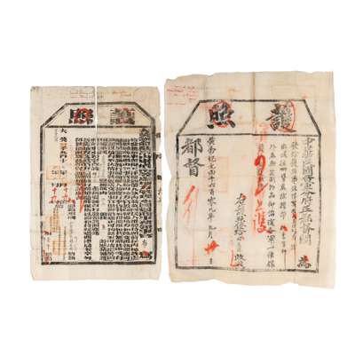 both ink on paper, issued to ‘Si Mei De’ in Chinese (inscribed Mr P. J. Smith), one dated 19 Feb 1917 valid for one year, one dated to the 4609th year of Huang Di, corresponding to 1911 (2)