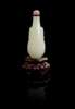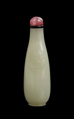 of elongated pear form, plain overall except for a pair of mythical beast heads holding rings in relief as handles, the stone of even translucent white colour with a pink quartz stopper, with a wooden stand