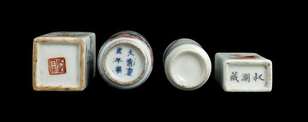 comprising: one of copper red with underglaze blue, depicting the ‘Empty Fort Strategy’ scene from Romance of the Three Kingdoms, base inscribed with a six-character Kangxi mark, 7.8cm high; one blue and white painted with figures, 7.2cm high; one famille rose square-section decorated with figures, the base with a two-character Tongzhi mark, 8.3cm high; and one of rectangular form painted with a cockerel on two sides, the base inscribed ‘Shu Lan Cang’, 6.6cm high, all with two wooden stands (4)