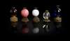 comprising: one pink glass etched with two shou roundels, one translucent blue glass, one clear glass, one amber glass, and one white, with various decorative metal mounts, of which one bears inscriptions on the base (5)