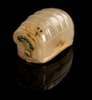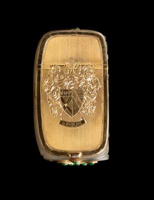 of oblong form, the top detailed with seven ribs, later mounted with British/European style gold-tone metals inset with green beads as snuff bottle, the hinged metal plate on the base engraved with an armorial coat of arms