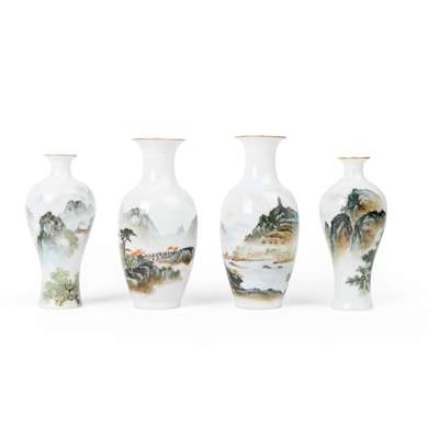 comprising: a pair of baluster vases and a pair of meiping vases, all similarly painted with shanshui landscape, the base inscribed with a six-character ‘Zhong Guo Jing De Zhen Zhi’ mark (4)