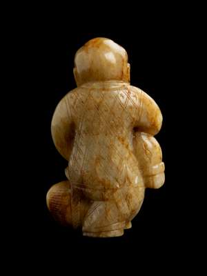 CELADON JADE WITH RUSSET INCLUSION CARVING OF A BOY RIDING PONY