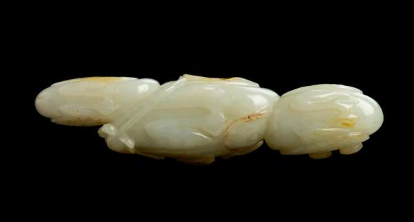 finely carved in openwork as three recumbent geese, the largest one grasping a stalk of leafy millet in its beak, the feathers on their closed wings delicately carved in low relief, the stone of white tone with russet skin