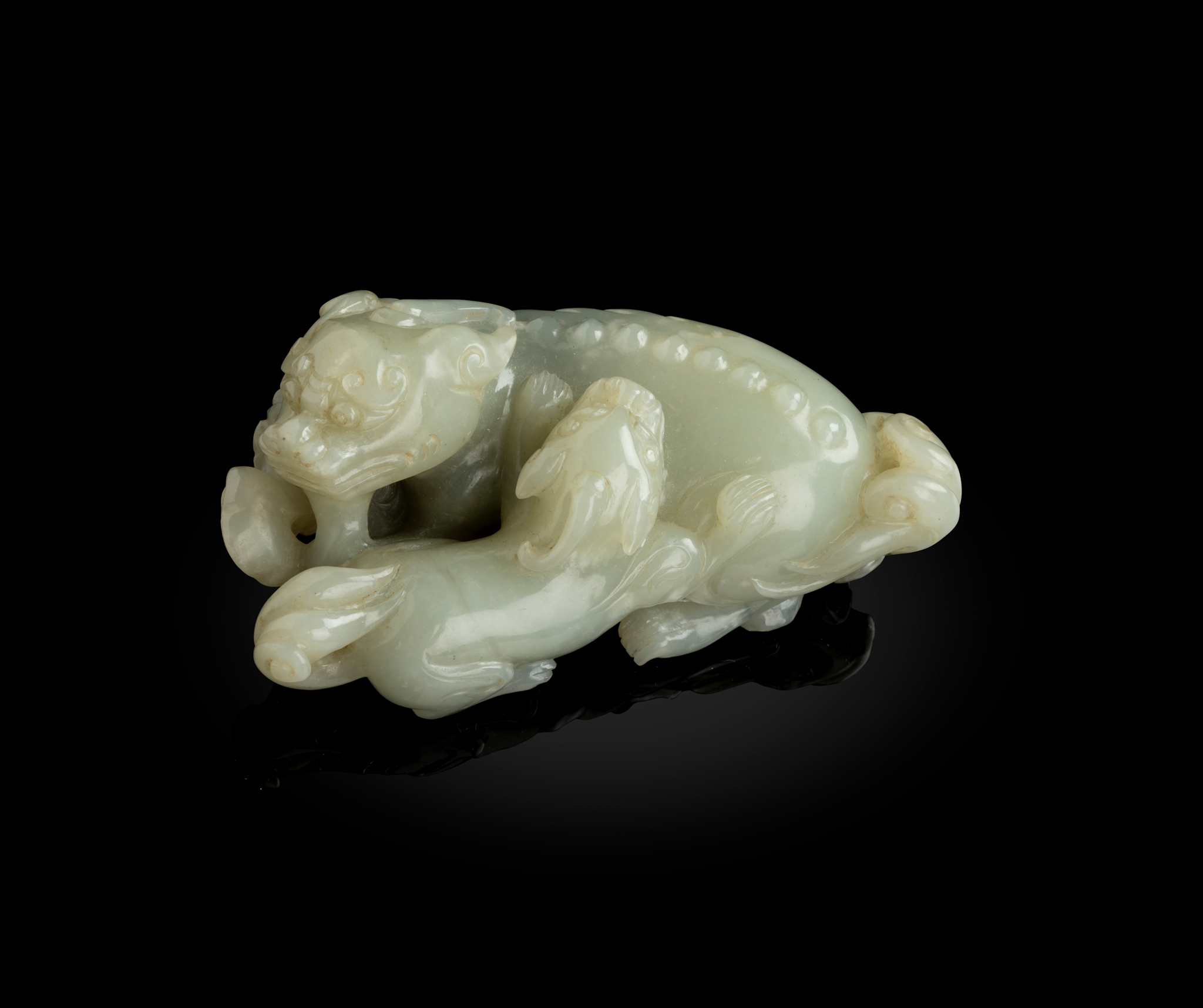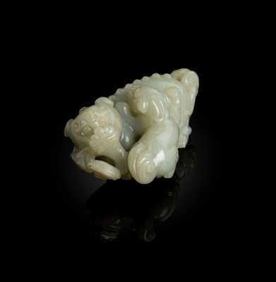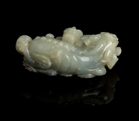 carved in round with a single-horned lion and her cub lively crawling onto her back, supported by ruyi clouds and lingzhi fungus, the stone of celadon hue with greyish inclusions