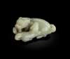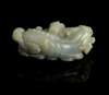 清 青玉帶灰皮雕祥獅帶子靈芝擺件