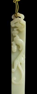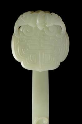 The decoration of the bat and the shou character on the head of the present sceptre together is a pun for Fu Shou, meaning ‘Prosperous and Happy Life’. While all sceptres are unique and no two identical pieces are recorded, this sceptre is comparable to two Qing dynasty jade sceptres in the collection of the National Palace Museum, Taipei, both decorated on the ruyi-head with a large bat with outstretched wings embracing a stylised shou character in low relief, museum no. Gu Yu 故玉2302 and 1438.