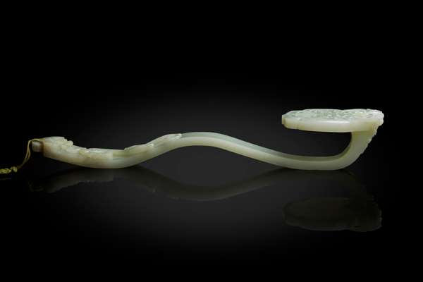 Ruyi sceptres, by definition, are highly auspicious objects favoured for their shape and ornamentation which represent the propitious expression ‘as you wish’. Their origin remains a matter of speculation, with the popular belief being that their shape evolved from back-scratchers commonly made in bamboo or bone. However, their function is likely to have derived from hu tablets which were items of authority and social rank held in the hands of officials in ancient China. This theory is supported by the mention of a ruyi sceptre being used as a tool of command in Fang Xuanling’s (579-648), Jin Shu (The Book of the Jin Dynasty), the official history of the Jin Dynasty (265-420). For more information on the origins of sceptres, see Yuan Te-hsing’s article in Masterpieces of Chinese Ju-I Scepters in the National Palace Museum, Taipei, 1974, pp. 86-90.