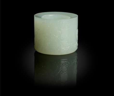 of cylindrical form, the exterior carved in low relief with a mythical animal beside a large pine tree, the stone of even whitish colour