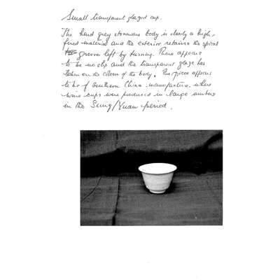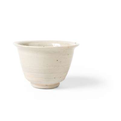 thinly potted with steep sides and everted mouth, covered in a translucent glaze stopping above the foot