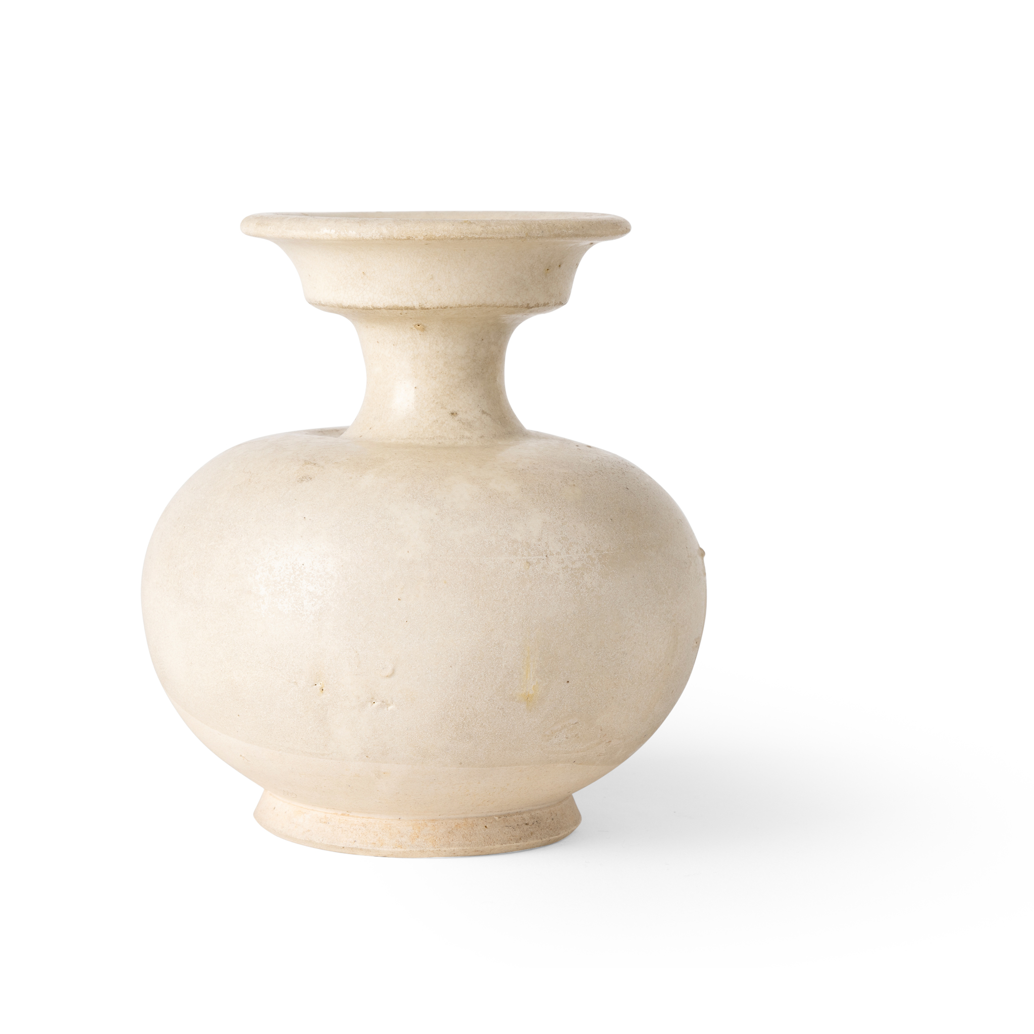 of slightly compressed globular form surmounted with a flared galleried rim on the short cylindrical neck, covered with a creamy white glaze thinning and stopping irregularly above foot