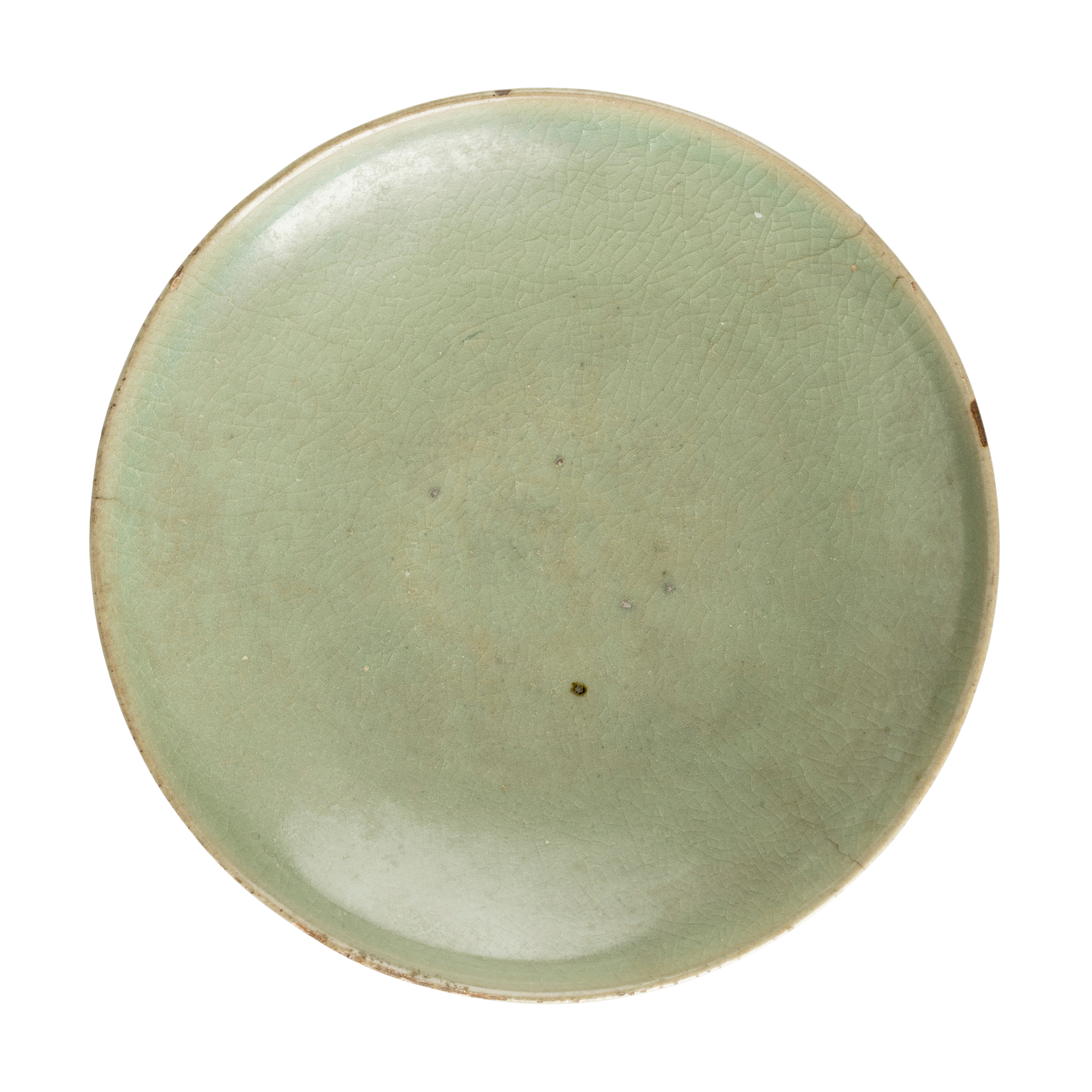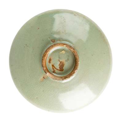 potted with shallow sides supporting on a short straight foot rising to an upturned rim, covered inside and out with a crackled glaze of rich greyish-green colour save for the foot rim exposing the buff body