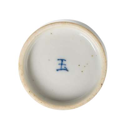 of rouleaux form, the sides painted with two tripod bronze ding censers with other ruyi sceptre and pouch, the shoulder further with other antiquities, the base inscribed with one-character ‘Yu’ mark in underglaze blue