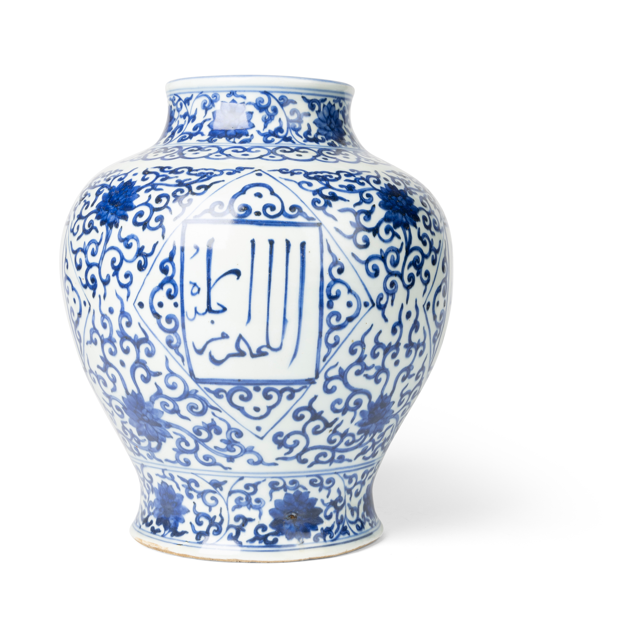 of baluster form, the body with four rectangular panels of Arabic inscriptions reserved on lonzenge-form cartouches, all against lotus with scrolling tendrils, base unglazed