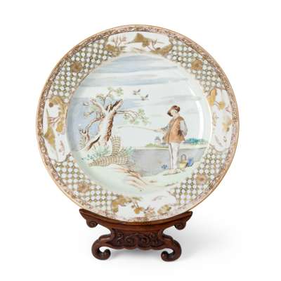 清乾隆 約1740-1745 外銷粉彩西洋人物垂釣圖盤