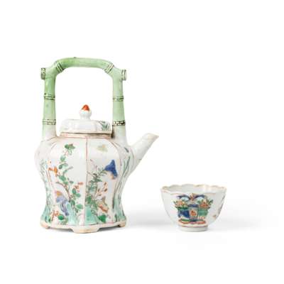 comprising: an octagonal teapot, each section of the body painted with floral sprays with rockwork, some further with butterflies, set with a bamboo-form overhead handle, all raised on four bracket feet; and a lobed teacup with foliated mouth rim, decorated with bogu motif on the exterior (2)