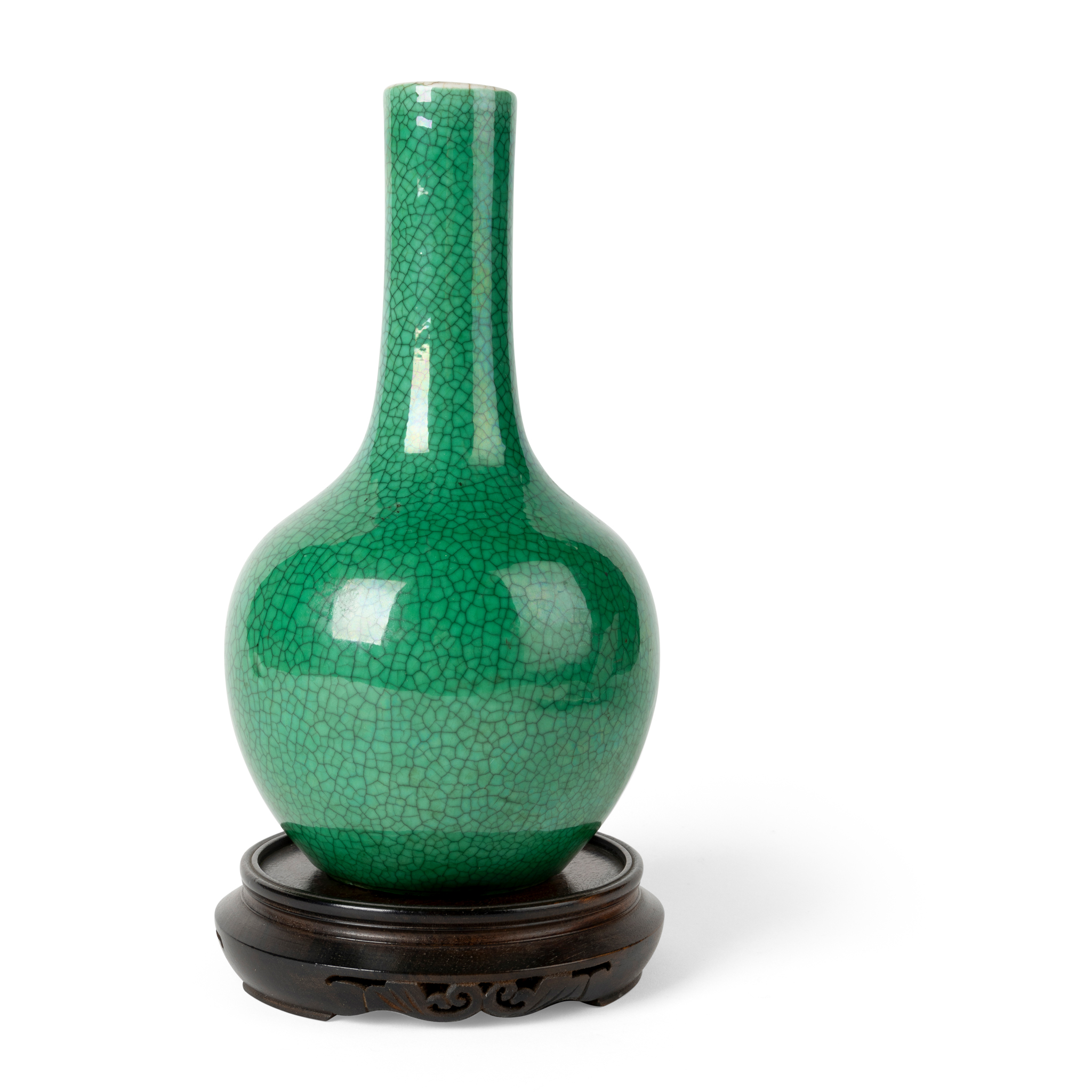 covered on the exterior with a transparent glaze of bright apple-green tone applied over a creamy-white glaze suffused with black and russet crackle which also covers the interior of the neck and the base, with a wooden base