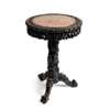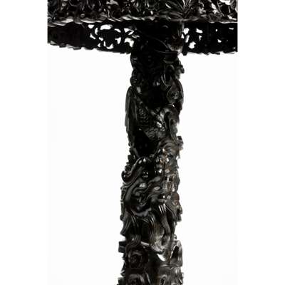the circular top with pink marble insert, over a pierced and carved frieze depicting tree shrews and fruiting vines, raised on a foliate carved baluster column with a large dragon meandering around, supported on tripod cabriole legs ending on claw feet