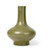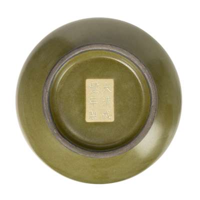 of compressed pear form rising from a spreading foot to a tall cylindrical neck, covered with an evenly-mottled dark green glaze stopping at the foot, the base with the incised with a six-character Xianfeng mark