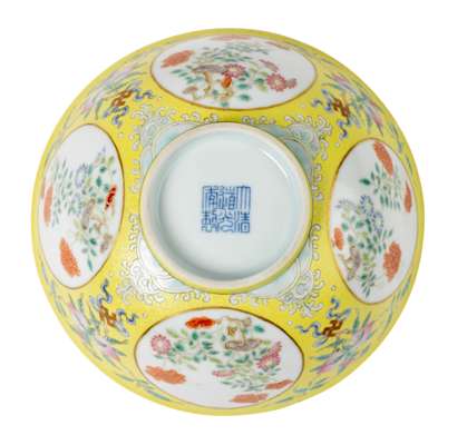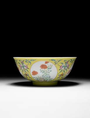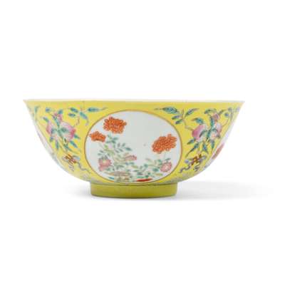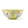 FINE YELLOW-GROUND FAMILLE ROSE SGRAFFITO 'MEDALLION' BOWL