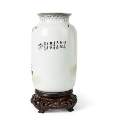 二十世紀 鄧肖禹 彩繪祥鴿叢花圖對瓶 帶木座(共兩件)