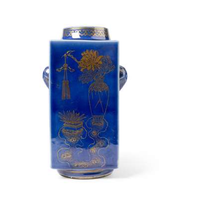 Compare to a blue-glazed and gilt square cylindrical vase, cong, Guangxu six-character mark and of the period, sold at Bonhams London, 17 May 2012, lot 321.