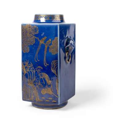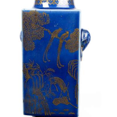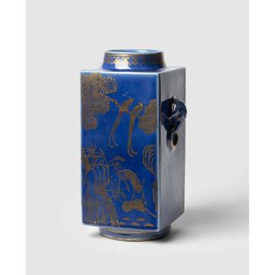BLUE-GLAZED GILT-DECORATED SQUARE-SECTION VASE, CONG