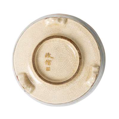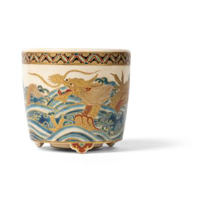 the slightly tapered cylindrical body rested on three bracket feet, painted on the exterior with a dragon in a ferocious sea, the base signed ‘Masonobu’