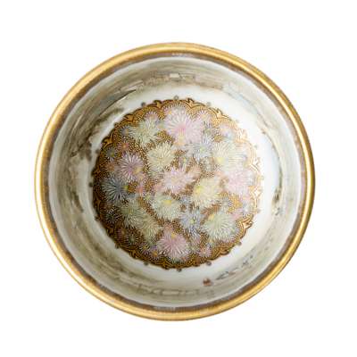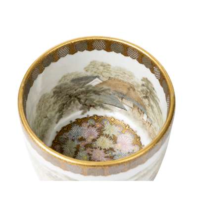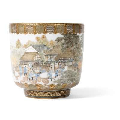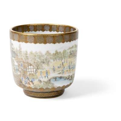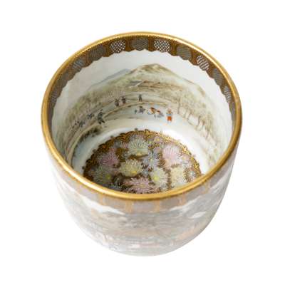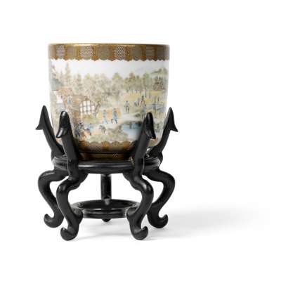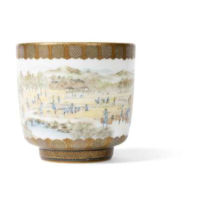 明治或以後 ‘加賀國九谷(?)製白泉描’款 薩摩燒農耕圖杯 帶木座