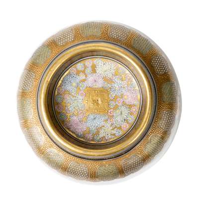 finely painted inside out with a continuous scene of figures working on a farm, the central medallion of interior with millefleur, inscribed on the base with a nine-character mark, Kaga Province, possibly Kutani Sei, and possibly Hakusen Joyo, with a wooden stand