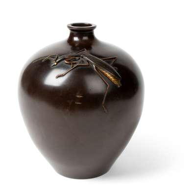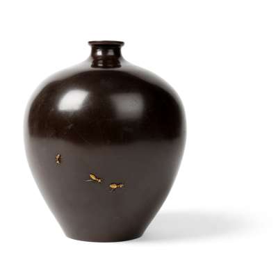 of ovoid form, sensitively decorated in relief with a mantis on one side of the shoulder, reverse with three ants, signed in chiselled characters on the base Dainihon Kyoto no ju Ikkodo Miyabe Atsuyoshi (Ikkodo Miyabe Atsuyoshi of Kyoto in Japan), with a kao