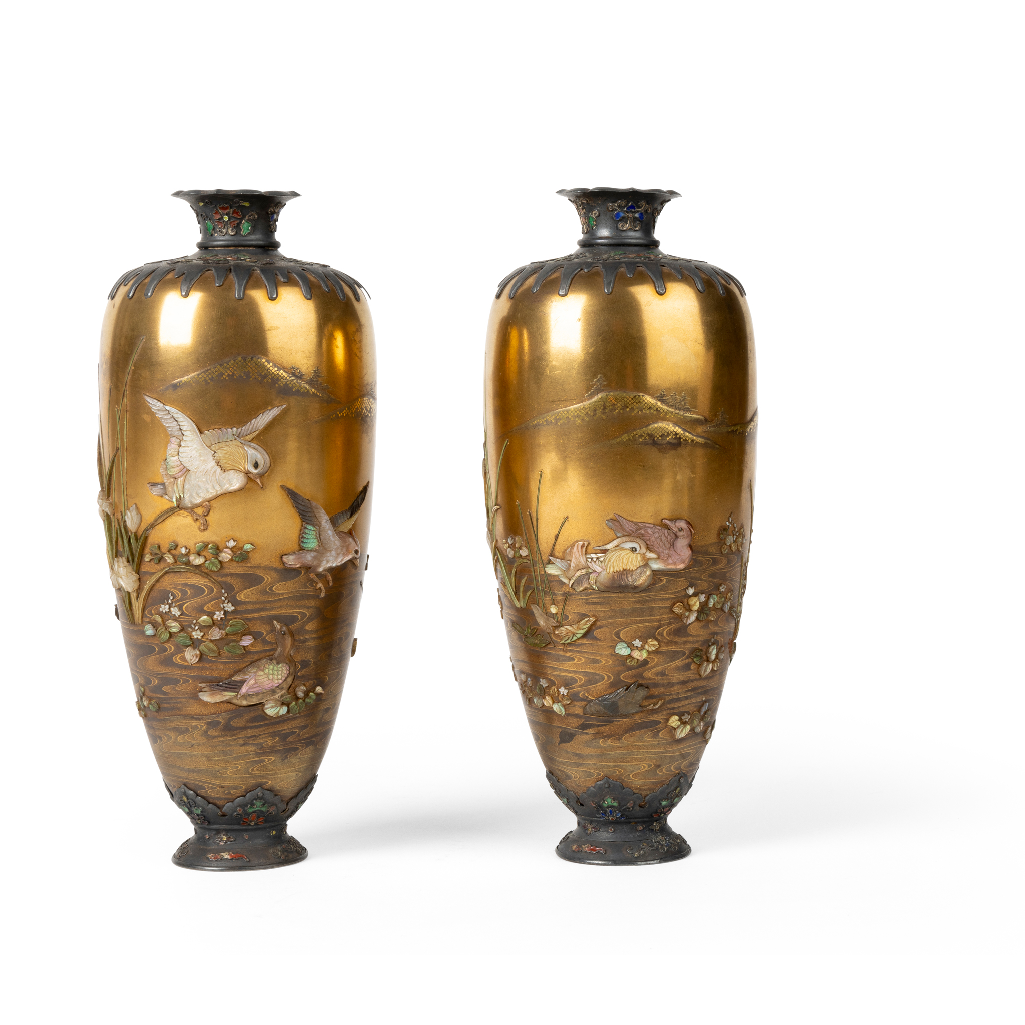 each gold-lacquered body inset with mother-of-pearl and other semiprecious stones with four ducks swimming in a pond and one in flight near raised mountains in okibirame, further inlaid with aquatic floral and foliage, with detailed ripples, the mouth and foot applied with silver decorated with floral sprays in coloured enamels (2)