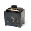 of rectangular form supported on four bracket feet, one long-side decorated with a crane resting by the river bank under a willow tree, three other sides adorned with large chrysanthemum, reed and small blossoming flowers, the domed cover with prunus flowers and bamboo form finial, the base inscribed with a five-character ‘Kyoto Kuroda Zo’ mark