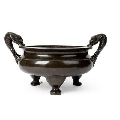 Stylistically, a comparable large bronze tripod censer with chilong handles, dated to the late Ming dynasty, note the similar treatment of the waisted band with ridge on the mouth, sold at Sotheby's London, 22 February 2022, lot 50; Two other censers with similar design on the mouth, dated to Ming and late Ming dynasty, were sold at Christie's London, 18 Mar 2015, lot 686 and Sotheby's London, 10 November 2017, lot 366.