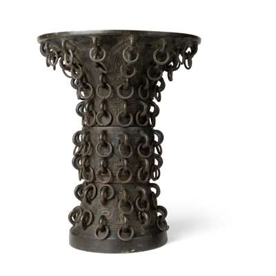heavily cast in trumpet form with raised centre, decorated with taotie mask all over on diaper ground, bearing lugs suspending rings, a lug on the base