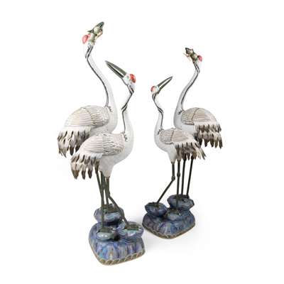 each modelled as a pair of large and smaller cranes perched on a rocky outcrop encircled by rolling waves, standing on tall legs detailed with cylindrical bands, their long necks gracefully curve as the smaller crane looks backwards, the taller crane with two peaches on a sprig in its long pointed beak, the bodies and feathers intricately picked out in black and white within gilt outline, their wings forming a cover for the hollow body (2)