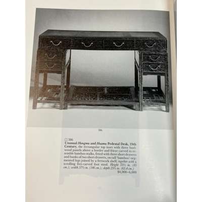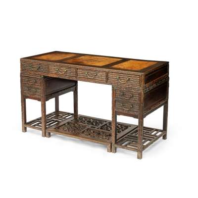 CARVED HONGMU WITH BURLWOOD INSET PEDESTAL DESK