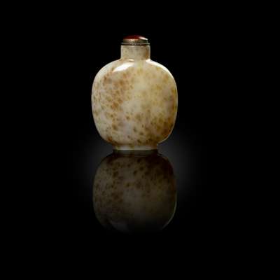 of flatted form with plain sides, the stone of white colour with brown spots, the stopper inset with brown glass bead