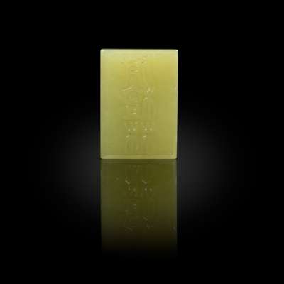 of rectangular form, the finial carved with two dragons with their body entwined, the seal front carved with three characters reading ‘Zhan Tan Lin’, the stone of even yellowing celadon tone