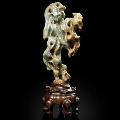 standing on a narrow foot and expanding towards the top, carved and pierced in the form of a scholar's rock, the perforated stone with grey and pale celadon tone, with russet patches and streaks, standing on a modern-made fitted wooden stand