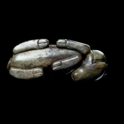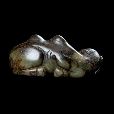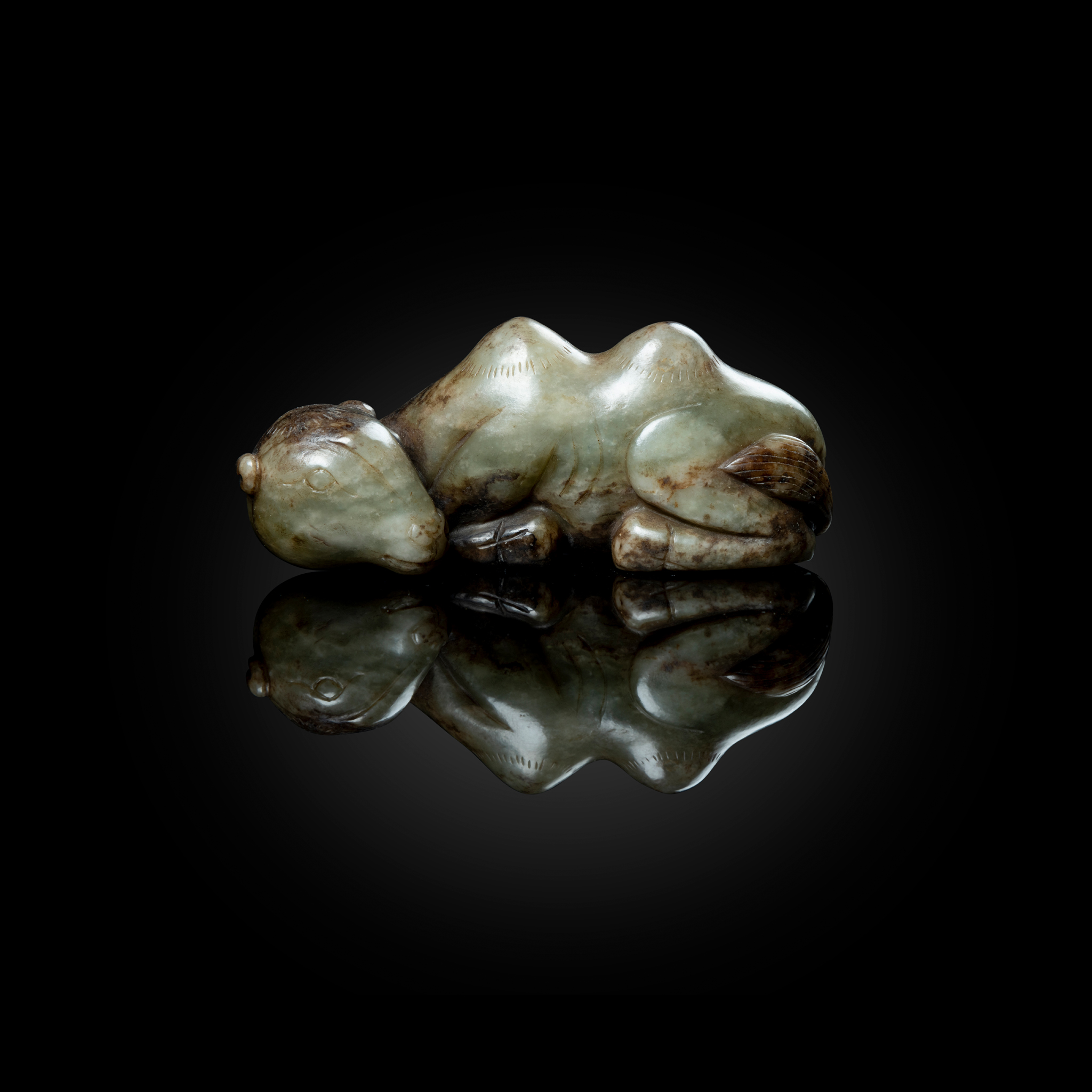 the animal in recumbent position, turning its head to the left and looking backwards, its bulging eyes, two humps and curling tail minutely incised, the stone of celadon colour with russet inclusions especially on the back