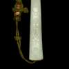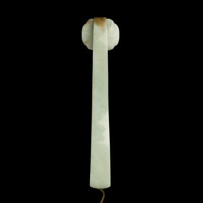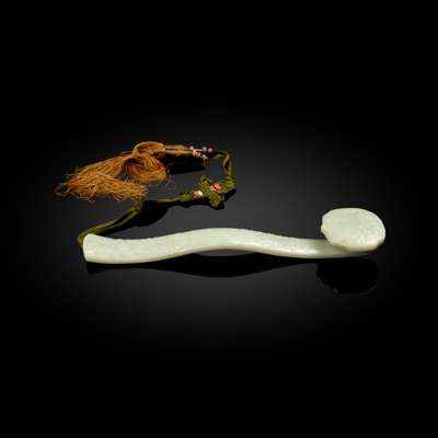 the sceptre with a characteristic ruyi-shaped head carved with a caparisoned elephant bearing a vase balancing two beribboned auspicious emblems, the long curved shaft carved in relief on top with a shou character above, a vase, double-fish, and chime and meandering tassels, ending with a bat, the stone of an even pale tone with russet inclusions on the top back, with attached silk tassel