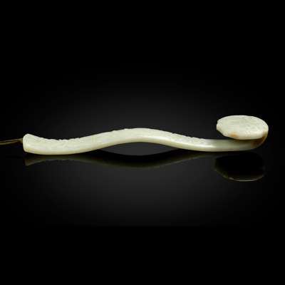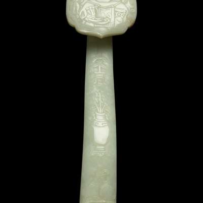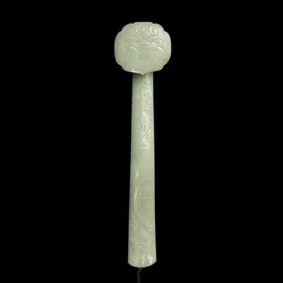 CHINESE PALE CELADON JADE 'CAPARISONED ELEPHANT' RUYI SCEPTRE