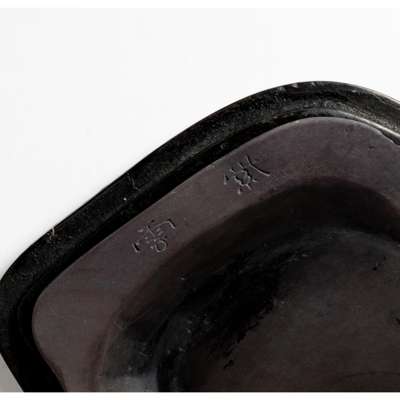 the oval stone with a central grinding palette, the top with a small niche for water, carved with title ‘Zi Yun (Purple Cloud)’, the reverse with remnants of stone skin, with hardwood box and cover