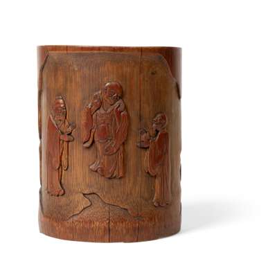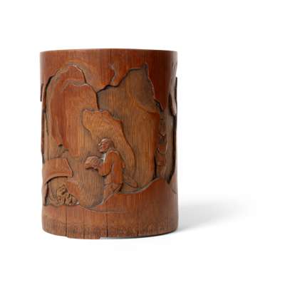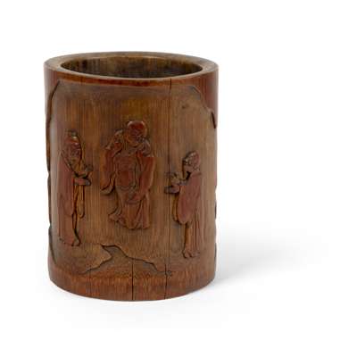 decorated with joyous figures visited by a friend with his boy assistants arriving by one carrying a wrapped qin musical instrument